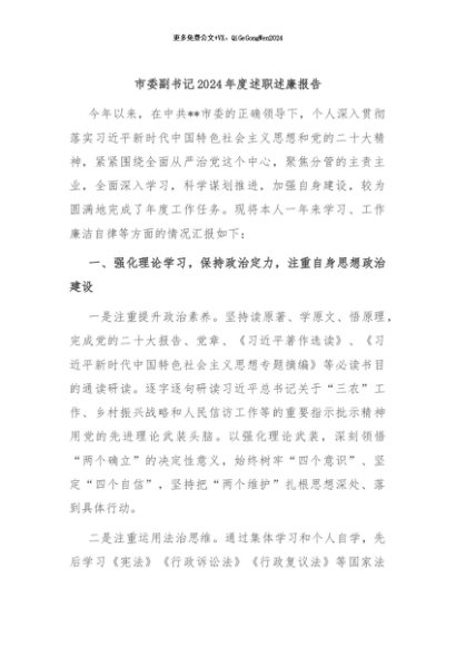 / 【七哥公文】2024年:市委副书记2024年度述职述廉报告+更多免费公文+VX:QiGeGongWen2024