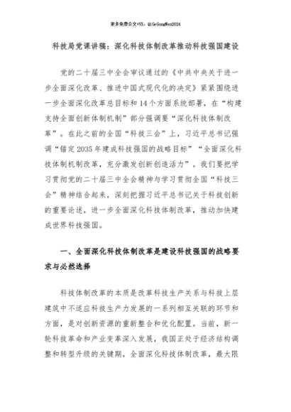 / 【七哥公文】2024年:科技局党课讲稿:深化科技体制改革推动科技强国建设+更多免费公文+VX:QiGeGongWen2024