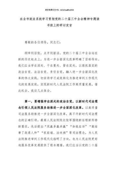 【七哥公文】2024年:在全市政法系统学习贯彻党的二十届三中全会精神专题读书班上的研讨发言+更多免费公文+VX:QiGeGongWen2024