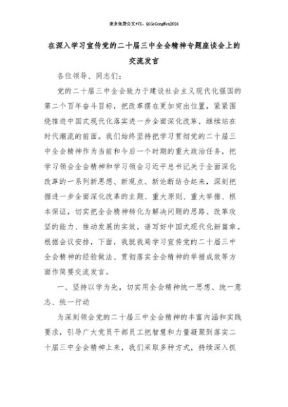【七哥公文】2024年:在深入学习宣传党的二十届三中全会精神专题座谈会上的交流发言+更多免费公文+VX:QiGeGongWen2024