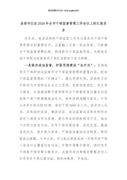 【七哥公文】2024年:县委书记在2024年全市干部监督管理工作会议上的汇报发言+更多免费公文+VX:QiGeGongWen2024