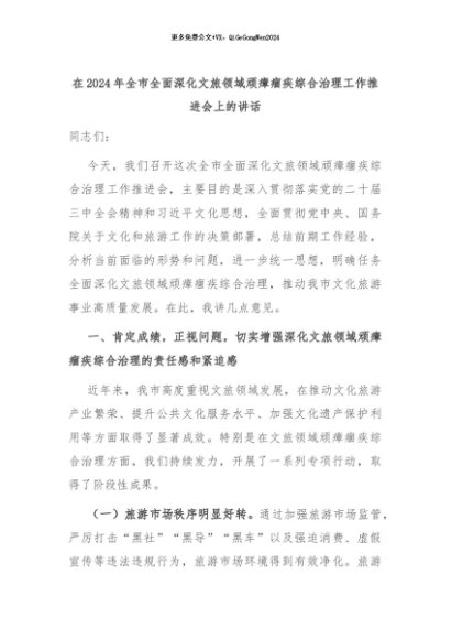 【七哥公文】2024年:在2024年全市全面深化文旅领域顽瘴痼疾综合治理工作推进会上的讲话+更多免费公文+VX:QiGeGongWen2024