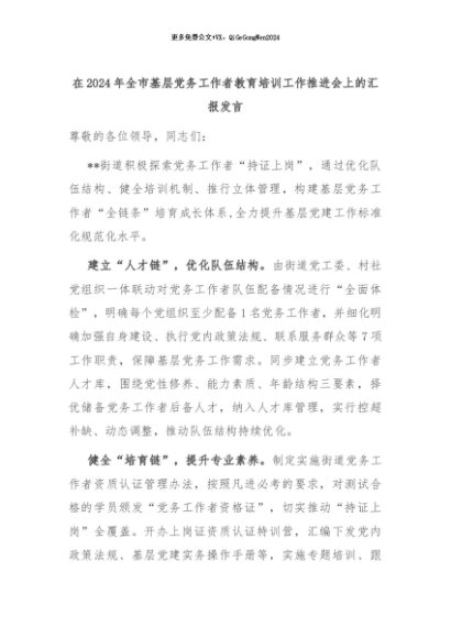 【七哥公文】2024年:在2024年全市基层党务工作者教育培训工作推进会上的汇报发言+更多免费公文+VX:QiGeGongWen2024