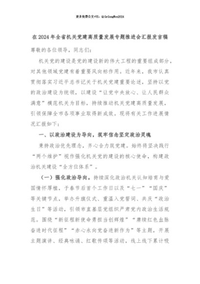 【七哥公文】2024年:在2024年全省机关党建高质量发展专题推进会汇报发言稿+更多免费公文+VX:QiGeGongWen2024