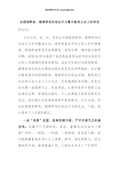 【七哥公文】2024年:在酒驾醉驾、赌博等违纪违法行为警示教育大会上的讲话+更多免费公文+VX:QiGeGongWen2024