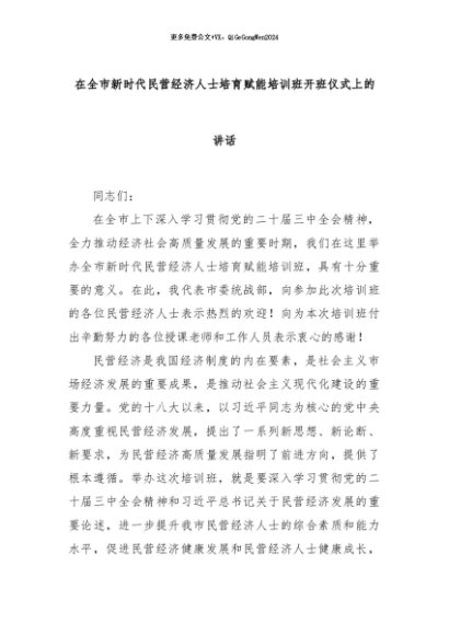 【七哥公文】2024年:在全市新时代民营经济人士培育赋能培训班开班仪式上的讲话+更多免费公文+VX:QiGeGongWen2024