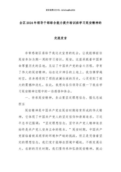 【七哥公文】2024年:全区2024年领导干部综合能力提升培训班学习延安精神的交流发言+更多免费公文+VX:QiGeGongWen2024