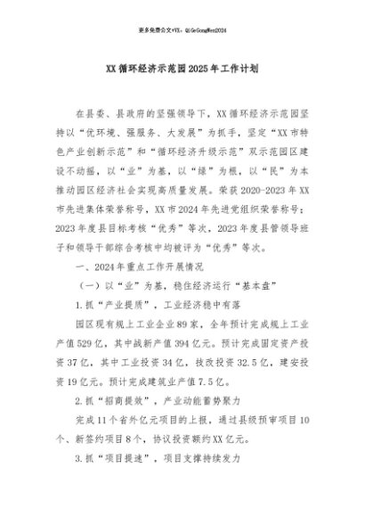 【七哥公文】2024年:XX循环经济示范园2025年工作计划+更多免费公文+VX:QiGeGongWen2024