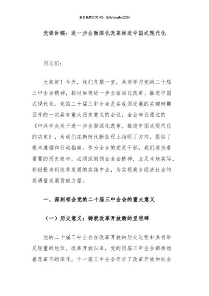 / 【七哥公文】2024年:党课讲稿:进一步全面深化改革推进中国式现代化+更多免费公文+VX:QiGeGongWen2024