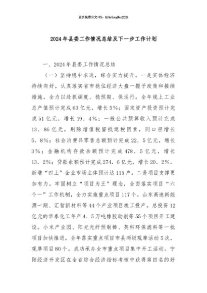 / 【七哥公文】2024年:2024年县委工作情况总结及下一步工作计划+更多免费公文+VX:QiGeGongWen2024