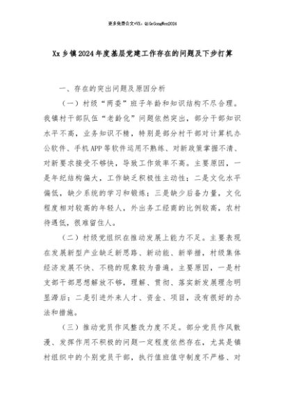 【七哥公文】2024年:Xx乡镇2024年度基层党建工作存在的问题及下步打算+更多免费公文+VX:QiGeGongWen2024