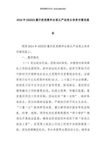 【七哥公文】2024年:2024年XXXXXX履行抓党建和全面从严治党主体责任情况报告+更多免费公文+VX:QiGeGongWen2024