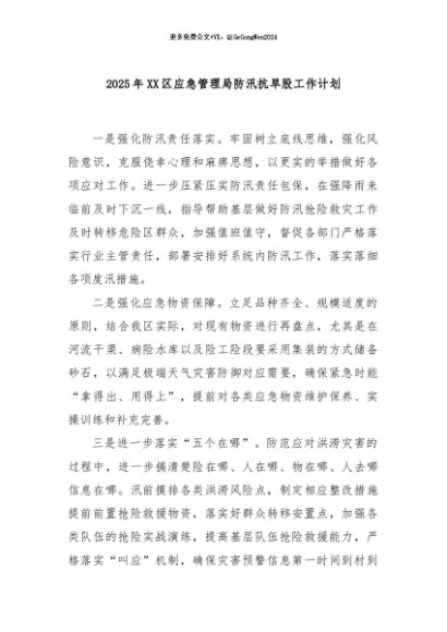 / 【七哥公文】2024年:2025年XX区应急管理局防汛抗旱股工作计划+更多免费公文+VX:QiGeGongWen2024