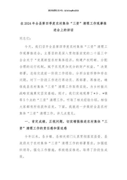 【七哥公文】2024年:在2024年全县第四季度农村集体“三资”清理工作观摩推进会上的讲话+更多免费公文+VX:QiGeGongWen2024
