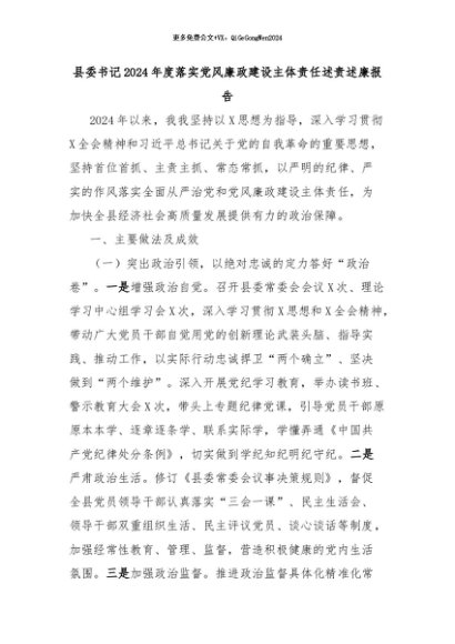 【七哥公文】2024年:县委书记2024年度落实党风廉政建设主体责任述责述廉报告+更多免费公文+VX:QiGeGongWen2024