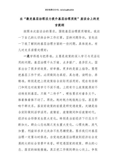 【七哥公文】2024年:在“激发基层治理活力提升基层治理质效”座谈会上的发言提纲+更多免费公文+VX:QiGeGongWen2024