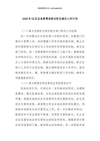 / 【七哥公文】2024年:2025年XX区应急管理局综合防灾减灾工作计划+更多免费公文+VX:QiGeGongWen2024