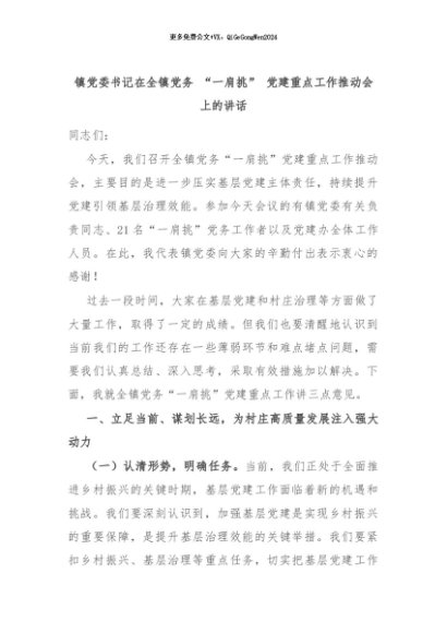 【七哥公文】2024年:镇党委书记在全镇党务 “一肩挑” 党建重点工作推动会上的讲话+更多免费公文+VX:QiGeGongWen2024