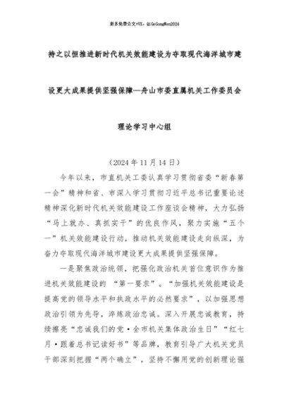 【七哥公文】2024年:持之以恒推进新时代机关效能建设为夺取现代海洋城市建设更大成果提供坚强保障—xx市委直属机关工作委员会理论学习中心组+更多免费公文+VX:QiGeGongWen2024