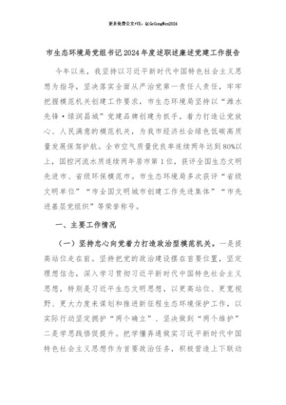 【七哥公文】2024年:市生态环境局党组书记2024年度述职述廉述党建工作报告+更多免费公文+VX:QiGeGongWen2024