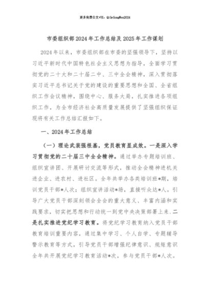 / 【七哥公文】2024年:市委组织部2024年工作总结及2025年工作谋划+更多免费公文+VX:QiGeGongWen2024