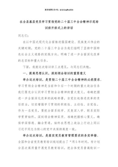 【七哥公文】2024年:在全县基层党员学习贯彻党的二十届三中全会精神示范培训班开班式上的讲话+更多免费公文+VX:QiGeGongWen2024