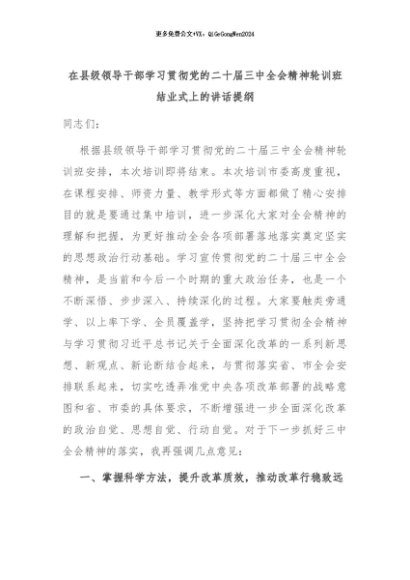 【七哥公文】2024年:在县级领导干部学习贯彻党的二十届三中全会精神轮训班结业式上的讲话提纲+更多免费公文+VX:QiGeGongWen2024