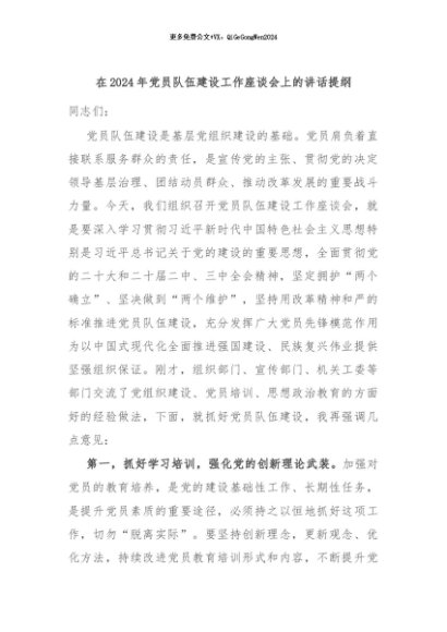 / 【七哥公文】2024年:在2024年党员队伍建设工作座谈会上的讲话提纲+更多免费公文+VX:QiGeGongWen2024