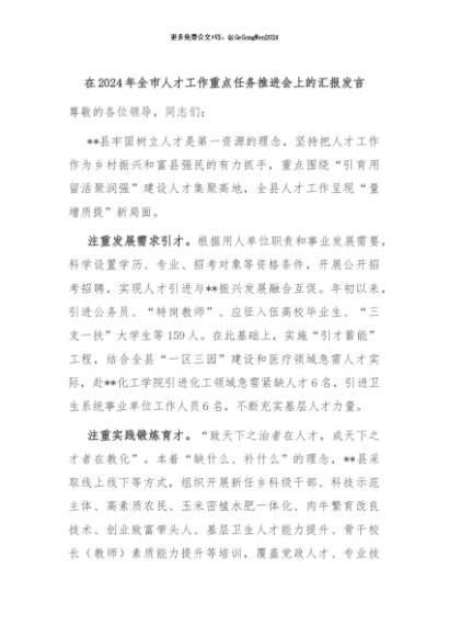 【七哥公文】2024年:在2024年全市人才工作重点任务推进会上的汇报发言+更多免费公文+VX:QiGeGongWen2024