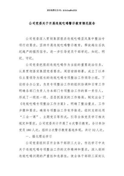 / 【七哥公文】2024年:公司党委关于开展违规吃喝警示教育情况报告+更多免费公文+VX:QiGeGongWen2024