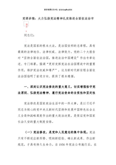 / 【七哥公文】2024年:党课讲稿:大力弘扬宪法精神扎实推进全面依法治市+更多免费公文+VX:QiGeGongWen2024
