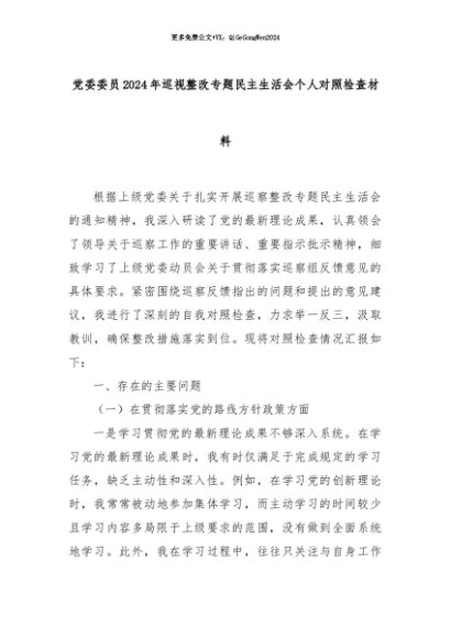 【七哥公文】2024年:党委委员2024年巡视整改专题民主生活会个人对照检查材料+更多免费公文+VX:QiGeGongWen2024