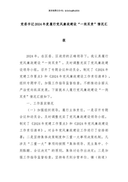 【七哥公文】2024年:党委书记2024年度履行党风廉政建设“一岗双责”情况汇报+更多免费公文+VX:QiGeGongWen2024