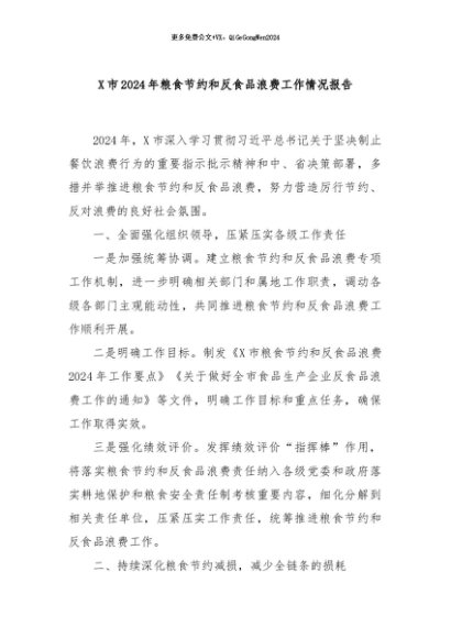/ 【七哥公文】2024年:X市2024年粮食节约和反食品浪费工作情况报告+更多免费公文+VX:QiGeGongWen2024