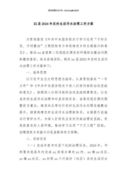 / 【七哥公文】2024年:XX县2024年农村生活污水治理工作方案+更多免费公文+VX:QiGeGongWen2024