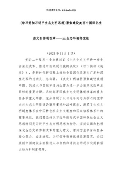 【七哥公文】2024年:(学习贯彻总书记生态文明思想)聚焦建设美丽中国深化生态文明体制改革——xx生态环境部党组+更多免费公文+VX:QiGeGongWen2024