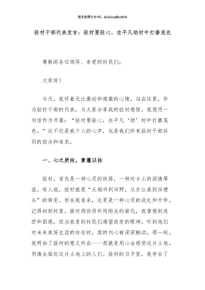 【七哥公文】2024年:驻村干部代表发言:驻村要驻心,在平凡助村中打磨底色+更多免费公文+VX:QiGeGongWen2024