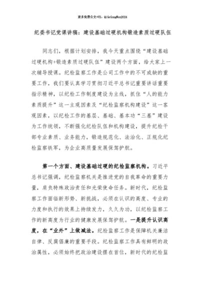 【七哥公文】2024年:纪委书记党课讲稿:建设基础过硬机构锻造素质过硬队伍+更多免费公文+VX:QiGeGongWen2024