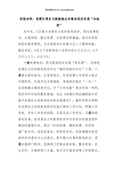 【七哥公文】2024年:经验材料:党建引领多元赋能跑出村集体经济发展“加速度”+更多免费公文+VX:QiGeGongWen2024