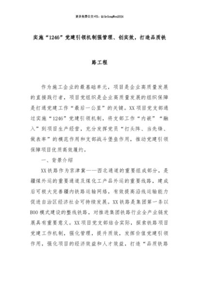 【七哥公文】2024年:实施“1246”党建引领机制强管理、创实效,打造品质铁路工程+更多免费公文+VX:QiGeGongWen2024