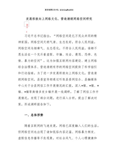 【七哥公文】2024年:发展积极向上网络文化、营造清朗网络空间研究+更多免费公文+VX:QiGeGongWen2024