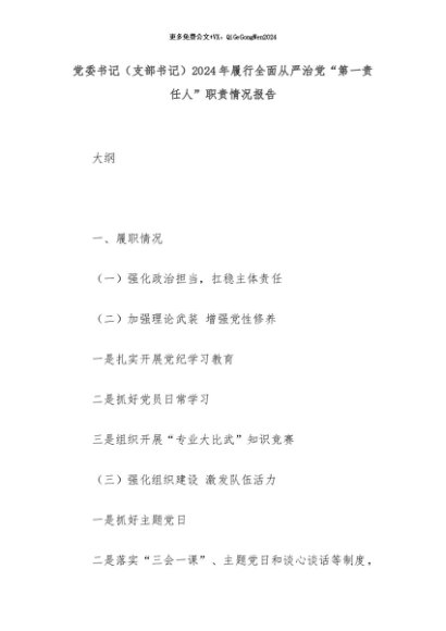 【七哥公文】2024年:党委书记(支部书记)2024年履行全面从严治党“第一责任人”职责情况报告+更多免费公文+VX:QiGeGongWen2024