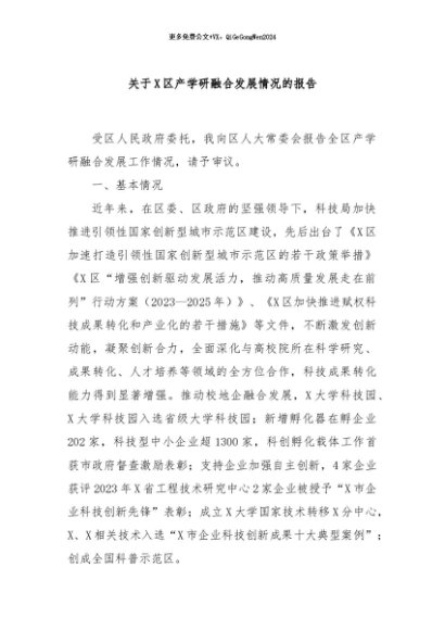 / 【七哥公文】2024年:关于X区产学研融合发展情况的报告+更多免费公文+VX:QiGeGongWen2024