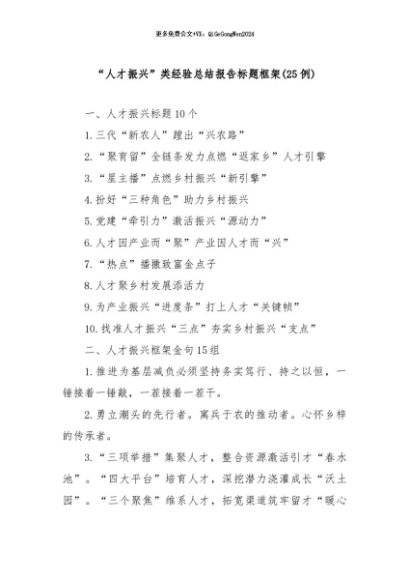 / 【七哥公文】2024年:(25例)“人才振兴”类经验总结报告标题框架+更多免费公文+VX:QiGeGongWen2024