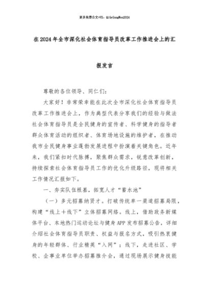 【七哥公文】2024年:在2024年全市深化社会体育指导员改革工作推进会上的汇报发言+更多免费公文+VX:QiGeGongWen2024
