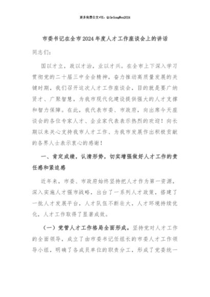 / 【七哥公文】2024年:市委书记在全市2024年度人才工作座谈会上的讲话+更多免费公文+VX:QiGeGongWen2024