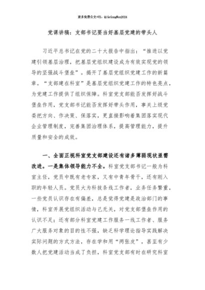 / 【七哥公文】2024年:党课讲稿:支部书记要当好基层党建的带头人+更多免费公文+VX:QiGeGongWen2024