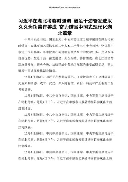 【七哥公文】2024年:11月中心组学习内容:11.4习近平在湖北考察时强调 鼓足干劲奋发进取 久久为功善作善成 奋力谱写中国式现代化湖北篇章+更多免费公文+VX:QiGeGongWen2024