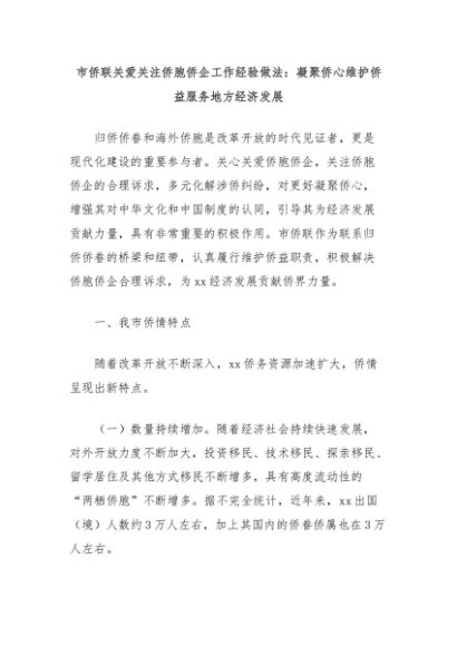 【七哥公文】2024年:市侨联关爱关注侨胞侨企工作经验做法:凝聚侨心维护侨益服务地方经济发展+更多免费公文+VX:QiGeGongWen2024