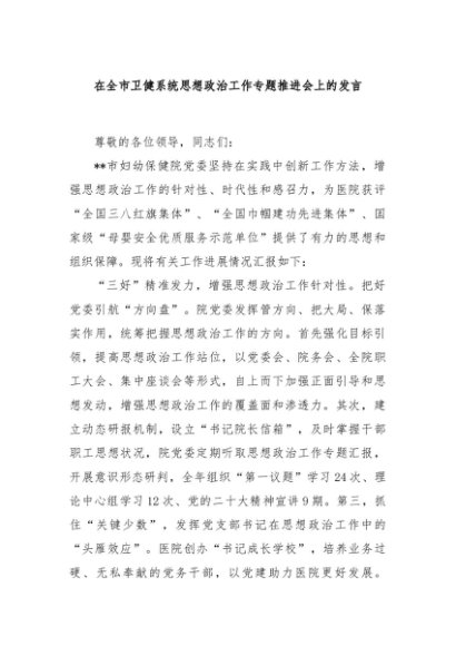 / 【七哥公文】2024年:在全市卫健系统思想政治工作专题推进会上的发言+更多免费公文+VX:QiGeGongWen2024
